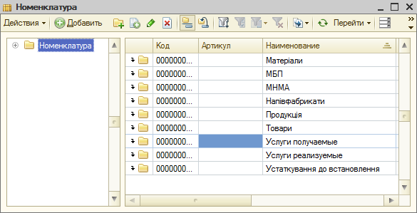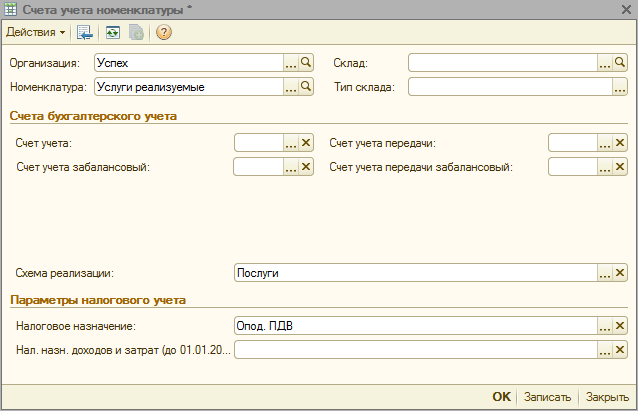 В правом окне справочника выделяем группу Услуги реализуемые → кнопка «Перейти» → Счета учета номенклатуры → Добавить → Схема реализации (Послуги) → Налоговое назначение (Опод.ПДВ).