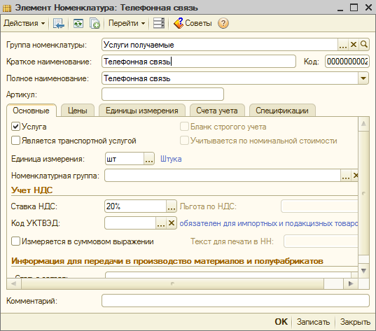 При заполнении справочника «Номенклатура» используем группу «Услуги получаемые».