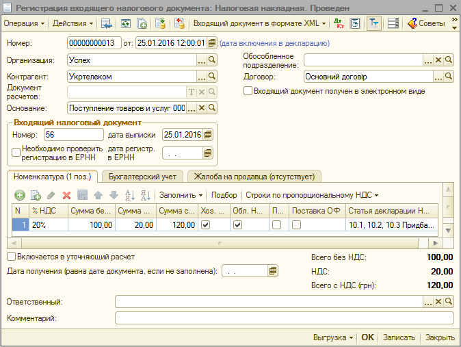1.2. Регистрация входящего налогового документа (отражаем факт получения Налоговой накладной от поставщика)