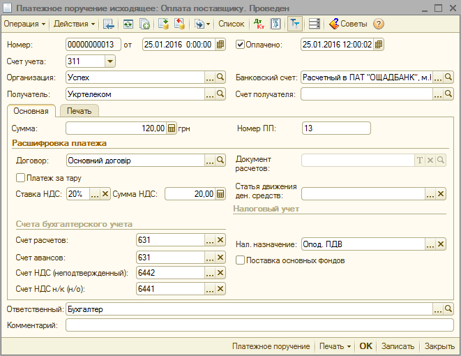 | 2 | 6442 | Укртелеком | 631 | Укртелеком | 20,00 | НДС при поступлении |