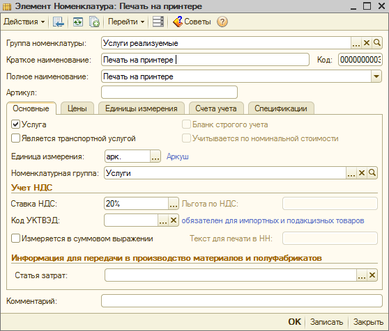 Вводим услугу «Печать на принтере»: кн. «Добавить» → вводим наименование услуги «Печать на принтере» → Ставим