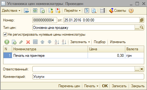 С помощью документа «Установка цен номенклатуры» указываем цену продажи на услуги 0,30 грн.: Меню «Предприятие» → Товары (материалы, услуги) → Установка цен номенклатуры → кн. «Добавить» → Дата (25.01) → Тип цен (Основная цена продажи).