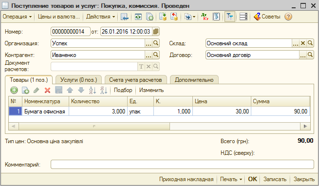 Панель функций → закладка «Покупка» → Поступление товаров и услуг → кнопка «Добавить» → Покупка, комиссия → Закладка «Товары» → заполняем документ: