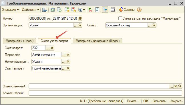Заполняем закладку «Счета учета затрат» см. рис. Счет можно взять или 231 «Основное производство» (если услуги – основной вид деятельности) или 232 «Вспомогательное производство» (если не основной). Статью затрат выбираем из группы «Прямі виробничі витрати по елементах».
