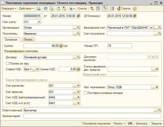 | 1 | 631 | Иваненко | 311 | 90,00 | Перечислены деньги поставщику |